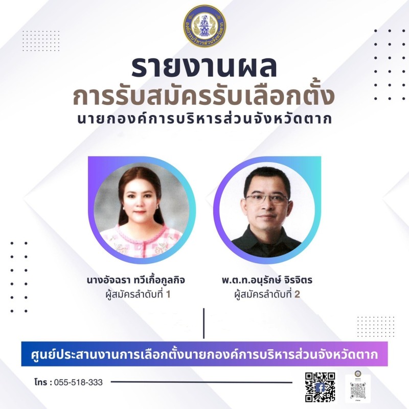 รายงานการรับสมัครรับเลือกตั้งนายกองค์การบริหารส่วนจังหวัดตาก ตั้งแต่วันที่ 4-8 พฤศจิกายน 2567 องค์การบริหารส่วนจังหวัดตาก โดย ศูนย์ประสานงานการเลือกตั้งนายกองค์การบริหารส่วนจังหวัดตาก ได้เปิดรับสมัครรับเลือกตั้ง นายกองค์การบริหารส่วนจังหวัดตาก ณ ห้องประชุมองค์การบริหารส่วนจังหวัดตาก อำเภอเมืองตาก จังหวัดตาก ตั้งแต่วันที่ 4-8 พฤศจิกายน 2567 ผลสรุปมีผู้มาสมัครทั้งสิ้นจำนวน 2 ราย ได้แก่ หมายเลข 1 นางอัจฉรา ทวีเกื้อกูลกิจ หมายเลข 2 พ.ต.ท.อนุรักษ์ จิรจิตร โดยกำหนดการเลือกตั้งนายกองค์การบริหารส่วนจังหวัดตาก ในวันอาทิตย์ ที่ 15 ธันวาคม 2567 เวลา 08.00-17.00 น. ณ หน่วยเลือกตั้งที่ท่านมีชื่ออยู่จึงขอเชิญชวนพี่น้องประชาชนผู้มีสิทธิเลือกตั้ง ออกไปใช้สิทธิใช้เสียงอย่างสุจริต ไม่ซื้อสิทธิ ขายเสียง
