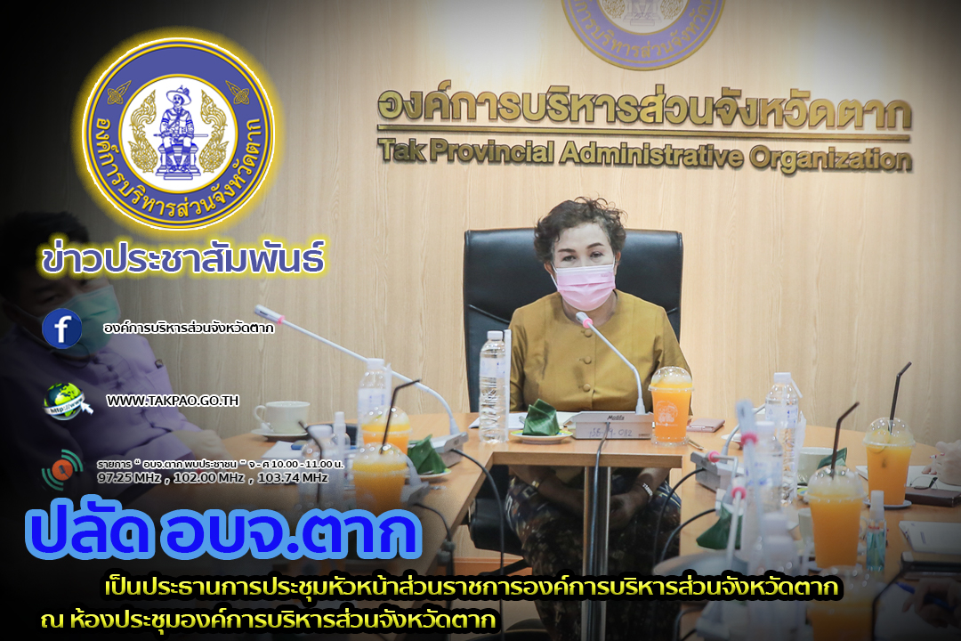 วันที่ 17 พฤษภาคม พ.ศ. 2565 นางสาวเปรมกมล ธีโรภาส ปลัดองค์การบริหารส่วนจังหวัดตาก เป็นประธานการประชุมหัวหน้าส่วนราชการองค์การบริหารส่วนจังหวัดตาก ณ ห้องประชุมองค์การบริหารส่วนจังหวัดตาก เพื่อติดตามภารกิจของแต่ละส่วนราชการให้แล้วเสร็จบรรลุตามเป้าหมายขององค์การบริหารส่วนจังหวัดตาก โดยมีคณะผู้บริหาร หัวหน้าส่วนราชการ และเจ้าหน้าที่ ที่เกี่ยวข้อง ในสังกัด องค์การบริหารส่วนจังหวัดตาก เข้าร่วมการประชุมในครั้งนี้
