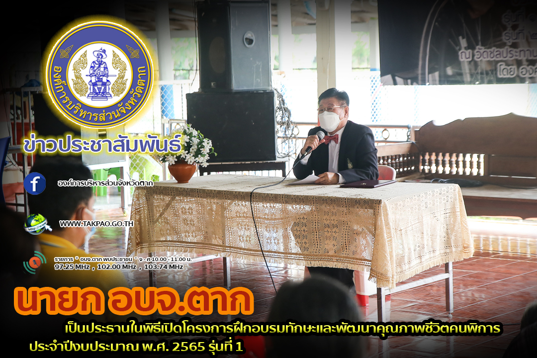 นายก อบจ.ตาก เป็นประธานในพิธีเปิดโครงการฝึกอบรมทักษะและพัฒนาคุณภาพชีวิตคนพิการ ประจำปีงบประมาณ พ.ศ. 2565 รุ่นที่ 1