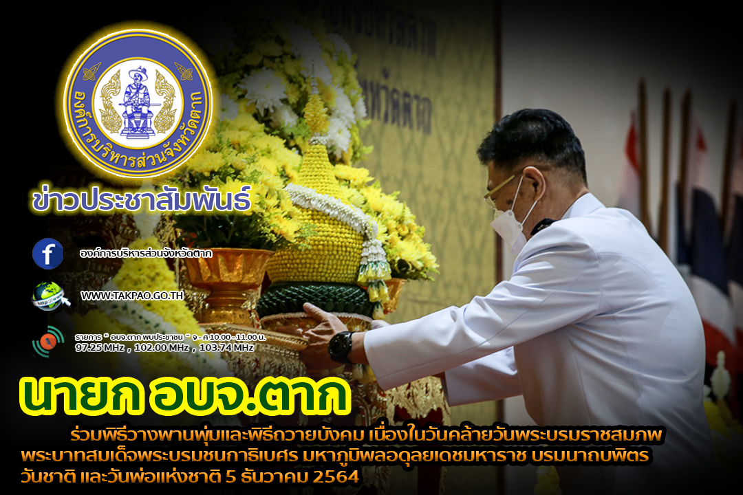 นายก อบจ.ตาก ร่วมพิธีวางพานพุ่มและพิธีถวายบังคม เนื่องในวันคล้ายวันพระบรมราชสมภพ พระบาทสมเด็จพระบรมชนกาธิเบศร มหาภูมิพลอดุลยเดชมหาราช บรมนาถบพิตร วันชาติ และวันพ่อแห่งชาติ 5 ธันวาคม 2564
