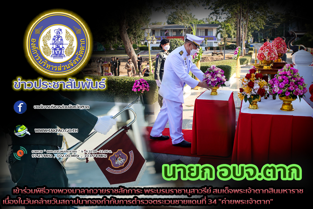 นายก อบจ.ตาก เข้าร่วมพิธีวางพวงมาลาถวายราชสักการะ พระบรมราชานุสาวรีย์ สมเด็จพระเจ้าตากสินมหาราช เนื่องในวันคล้ายวันสถาปนากองกำกับการตำรวจตระเวนชายแดนที่ 34 "ค่ายพระเจ้าตาก"