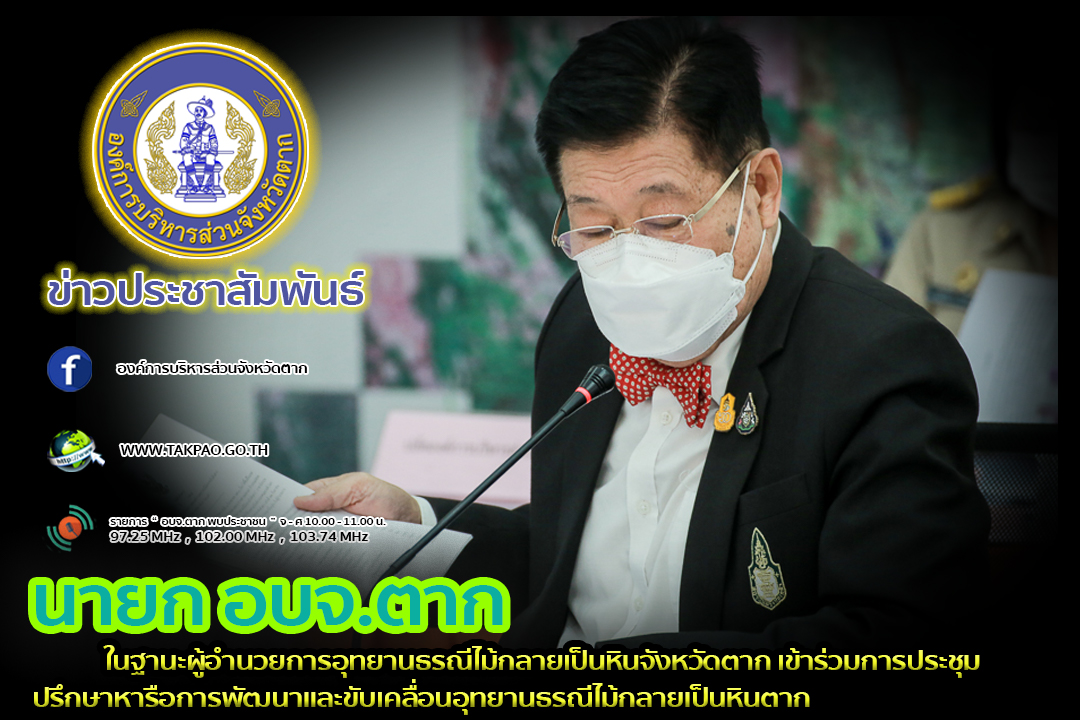 วันที่ 22 พฤศจิกายน พ.ศ. 2564 นายณัฐวุฒิ ทวีเกื้อกูลกิจ นายกองค์การบริหารส่วนจังหวัดตาก ได้มอบหมายให้นางสาวเพชรรัตน์ บุญมาวงศ์ หัวหน้าสำนักปลัดฯ องค์การบริหารส่วนจังหวัดตาก พร้อมเจ้าหน้าที่ เข้าร่วมการประชุมรับฟังความคิดเห็นเกี่ยวกับ (ร่าง) นโยบาย ทิศทาง 20 ปี และแผนปฏิบัติการด้านอุทยานธรณีและมรดกธรณีเชิงบูรณาการ ระยะที่ 1 (พ.ศ. 2565 - 2570) ครั้งที่ 2 ผ่านทางระบบสื่ออิเล็กทรอนิกส์ (Zoom Meeting) โดยมีนางอัปสร สอาดสุด ผู้อำนวยการศูนย์วิจัย และพัฒนาทรัพยากรธรณี กรมทรัพยากรธรณี เป็นประธานการประชุม