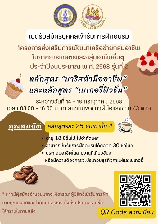 องค์การบริหารส่วนจังหวัดตากและสถาบันพัฒนาฝีมือแรงงาน 43 ตาก เปิดรับสมัครบุคคลเพื่อเข้ารับการฝึกอบรมตามโครงการส่งเสริมการพัฒนาเครือข่ายกลุ่มอาชีพในภาคการเกษตรและกลุ่มอาชีพอื่น ๆ ประจำปีงบประมาณ พ.ศ. 2568 รุ่นที่ 2 หลักสูตร“บาริสต้ามืออาชีพ” และหลักสูตร “เบเกอรี่ฟิวชั่น” ฝึกอบรมระหว่างวันที่ 14 - 18 กรกฎาคม 2568 เวลา 08.00 - 16.00 น. ณ สถาบันพัฒนาฝีมือแรงงาน 43 ตาก อำเภอเมืองตาก จังหวัดตาก คุณสมบัติ - อายุ 18 ปี - สามารถเข้ารับการฝึกอบรมได้ตลอด 30 ชั่วโมง - ประกอบอาชีพในสายงานที่เกี่ยวข้องหรือมีความต้องการที่จะประกอบธุรกิจกาแฟและเบเกอรี่ * หากมีผู้สมัครเป็นจำนวนมากจะพิจารณาผู้มีสิทธิ์เข้ารับการฝึกตามคุณสมบัติและลำดับการสมัคร ทั้งนี้จะประกาศรายชื่อให้ทราบในภายหลัง ----------------------------------------------- ลงทะเบียนคลิก https://docs.google.com/.../1FAIpQLSfjT3uh0sr.../viewform... #นายกจอย #อบจตาก #อัจฉรา #นายกอบจตาก #ฝึกอาชีพฟรี #บาริสต้า #เบเกอรี่ฟิวชั่น #พัฒนาทักษะสร้างอาชีพ #อบจตาก #แรงงานตาก #ตากต้องรู้ #ฝึกงานฟรี #เรียนฟรีมีวุฒิบัตร #ข่าวดีคนตาก