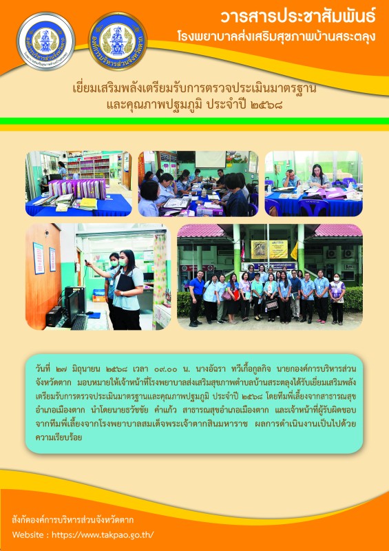 วันที่ ๑๕ มิถุนายน ๒๕๖๗ เวลา ๐๘.๓๐ น. นายณัฐวุฒิ ทวีเกื้อกูลกิจ นายกองค์การบริหารส่วนจังหวัดตาก มอบหมายให้นายพัลลภ อิ่มเอี่ยม ผู้อำนวยการโรงพยาบาลส่งเสริมสุขภาพตำบลบ้านสระตลุง เข้าร่วมโครงการป้องกันโรคขาดสารไอโอดีนในโครงการพระราชดำริสมเด็จพระเทพรัตนราชสุดาฯสยามบรมราชกุมารี โดยได้รับความอนุเคราะห์จากนายธนโชติ ทำสีนาค นายกองค์การบริหารส่วนตำบลตลุกกลางทุ่ง ร่วมพิธีเปิดโครงการฯ ณ หมู่บ้านชบา หมู่ที่ ๒ ตำบลตลุกกลางทุ่ง อำเภอเมอง จังหวัดตาก ผลการดำเนินงานเรียบร้อย