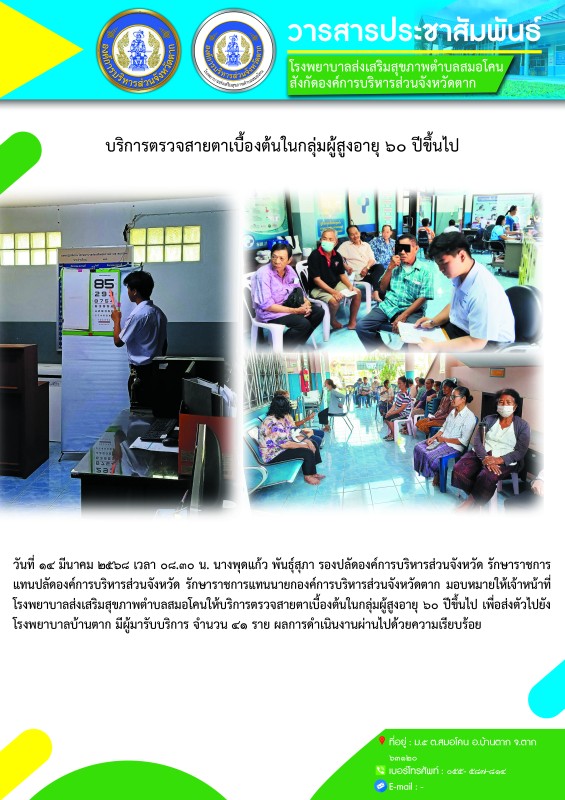 วันที่ ๑๑ มีนาคม ๒๕๖๘ เวลา ๐๘.๓๐ น. นางพุดแก้ว พันธุ์สุภา รองปลัดองค์การบริหารส่วนจังหวัด รักษาราชการแทนปลัดองค์การบริหารส่วนจังหวัด รักษาราชการแทนนายกองค์การบริหารส่วนจังหวัดตาก มอบหมายให้เจ้าหน้าที่โรงพยาบาลส่งเสริมสุขภาพตำบลสมอโคนร่วมกับคณะกรรมการ ประสานงานสาธารณสุขระดับอำเภอ (คปสอ.)ร่วมรณรงค์ตรวจคัดกรองไวรัสตับอักเสบ B และไวรัสตับอักเสบ C ในกลุ่มประชากรอายุ ๓๕ ปีขึ้นไป (คนที่ยังไม่เคยได้รับวัคซีน) เป้าหมายคือ ๑๕๗ ราย (ผลการดำเนินงาน ๑๖๒ ราย) ผลการดำเนินงานผ่านไปด้วยความเรียบร้อย