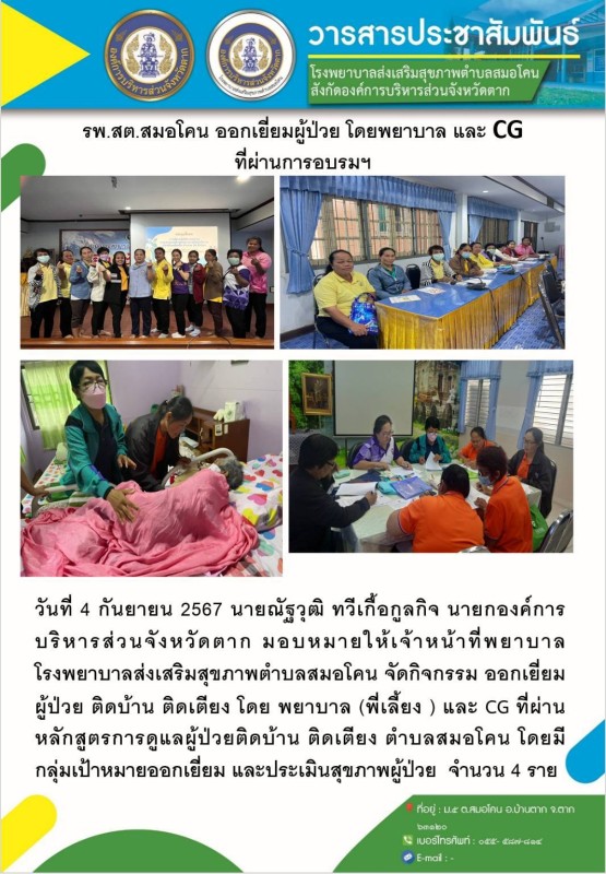 วันที่ ๒๕ ธันวาคม ๒๕๖๗ เวลา ๐๘.๓๐ น. นางพุดแก้ว พันธุ์สุภา รองปลัดองค์การบริหารส่วนจังหวัด รักษาราชการแทนปลัดองค์การบริหารส่วนจังหวัด ปฎิบัติหน้าที่นายกองค์การบริหารส่วนจังหวัดตาก มอบหมายให้เจ้าหน้าที่โรงพยาบาลส่งเสริมสุขภาพตำบลสมอโคนร่วมกับเจ้าหน้าที่นักกายภาพบำบัด ออกเยี่ยมผู้ป่วยติดบ้านติดเตียง จำนวน ๓ ราย ผลการดำเนินงานเป็นไปด้วยความเรียบร้อย