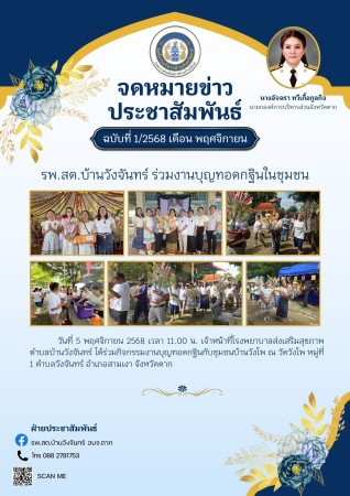 วันที่ 5 พฤศจิกายน 2568 เวลา 11.00 น. เจ้าหน้าที่โรงพยาบาลส่งเสริมสุขภาพตำบลบ้านวังจันทร์ ได้ร่วมกิจกรรมงานบุญทอดกฐินกับชุมชนบ้านวังโพ ณ วัดวังโพ หมู่ที่ 1 ตำบลวังจันทร์ อำเภอสามเงา จังหวัดตาก