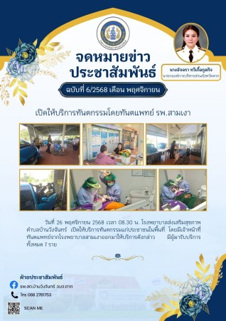 วันที่ 26 พฤศจิกายน 2568 เวลา 08.30 น. โรงพยาบาลส่งเสริมสุขภาพตำบลบ้านวังจันทร์ เปิดให้บริการทันตกรรมแก่ประชาชนในพื้นที่ โดยมีเจ้าหน้าที่ทันตแพทย์จากโรงพยาบาลสามเงาออกมาให้บริการดังกล่าว มีผู้มารับบริการทั้งหมด 7 ราย