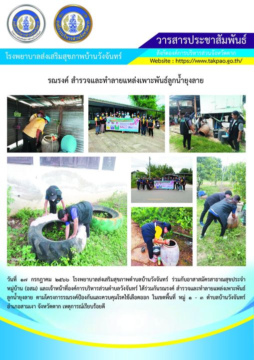 วันที่ 17 กรกฎาคม 2566 โรงพยาบาลส่งเสริมสุขภาพตำบลบ้านวังจันทร์ ร่วมกับ อาสาสมัครสาธาณณสุขประจำหมู่บ้าน (อสม).และเจ้าหน้าที่ องค์การบริหารส่วนตำบลวังจันทร์ ร่วมกันรณรงค์กำจัดลูกน้ำยุงลาย ตามโครงการรณรงค์ป้องกันและควบคุมโรคไข้เลือดออก ในเขตพื้นที่ หมู่ 1-3 ตำบลบ้านวังจันทร์ อำเภอสามเงา จังหวัดตาก