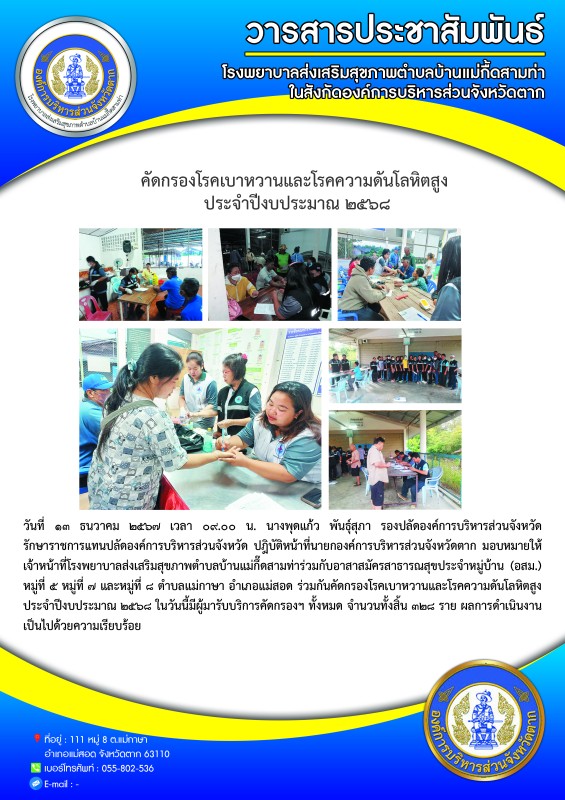 วันที่ ๑๓ ธนวาคม ๒๕๖๗ เวลา ๐๙.๐๐ น. นางพุดแก้ว พันธุ์สุภา รองปลัดองค์การบริหารส่วนจังหวัด รักษาราชการแทนปลัดองค์การบริหารส่วนจังหวัด ปฎิบัติหน้าที่นายกองค์การบริหารส่วนจังหวัดตาก มอบหมายให้เจ้าหน้าที่โรงพยาบาลส่งเสริมสุขภาพตำบลบ้านแม่กึ๊ดสามท่าร่วมกับอาสาสมัครสาธารณสุขประจำหมู่บ้าน (อสม.)หมู่ที่ ๕ หมู่ที่ ๗ และหมู่ที่ ๘ ตำบลแม่กาษา อำเภอแม่สอด ร่วมกันคัดกรองโรคเบาหวานและโรคความดันโลหิตสูง ประจำปีงบประมาณ ๒๕๖๘ในวันนี้มีผู้มารับบริการคัดกรองฯ ทั้งหมด จำนวนทั้งสิ้น ๓๒๘ ราย ผลการดำเนินงานเป็นไปด้วยความเรียบร้อย