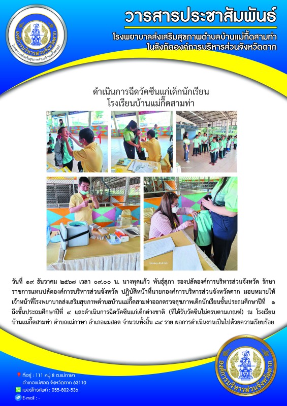 วันที่ ๑๙ ธันวาคม ๒๕๖๗ เวลา ๐๙.๐๐ น. นางพุดแก้ว พันธุ์สุภา รองปลัดองค์การบริหารส่วนจังหวัด รักษาราชการแทนปลัดองค์การบริหารส่วนจังหวัด ปฎิบัติหน้าที่นายกองค์การบริหารส่วนจังหวัดตาก มอบหมายให้เจ้าหน้าที่โรงพยาบาลส่งเสริมสุขภาพตำบลบ้านแม่กึ๊ดสามท่าออกตรวจสุขภาพเด็กนักเรียนชั้นประถมศึกษาปีที่ ๑ ถึงชั้นประถมศึกษาปีที่ ๔ และดำเนินการฉีดวัคซีนแก่เด็กต่างชาติ (ที่ได้รับวัคซีนไม่ครบตามเกณฑ์) ณ โรงเรียนบ้านแม่กึ๊ดสามท่า ตำบลแม่กาษา อำเภอแม่สอด จำนวนทั้งสิ้น ๘๔ ราย ผลการดำเนินงานเป็นไปด้วยความเรียบร้อย