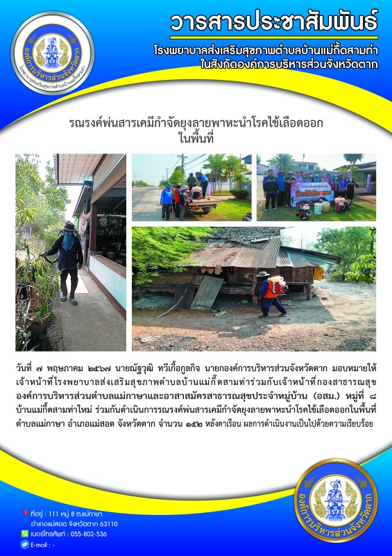 วันที่ ๗ พฤษภาคม ๒๕๖๗ นายณัฐวุฒิ ทวีเกื้อกูลกิจ นายกองค์การบริหารส่วนจังหวัดตาก มอบหมายให้เจ้าหน้าที่โรงพยาบาลส่งเสริมสุขภาพตำบลบ้านแม่กึ๊ดสามท่าร่วมกับเจ้าหน้าที่กองสาธารณสุข องค์การบริหารส่วนตำบลแม่กาษาและอาสาสมัครสาธารณสุขประจำหมู่บ้าน (อสม.) หมู่ที่ ๘ บ้านแม่กึ้ดสามท่าใหม่ ร่วมกันดำเนินการรณรงค์พ่นสารเคมีกำจัดยุงลายพาหะนำโรคไข้เลือดออกในพื้นที่ ตำบลแม่กาษา อำเภอแม่สอด จังหวัดตาก จำนวน ๑๕๒ หลังคาเรือน ผลการดำเนินงานเป็นไปด้วยความเรียบร้อย