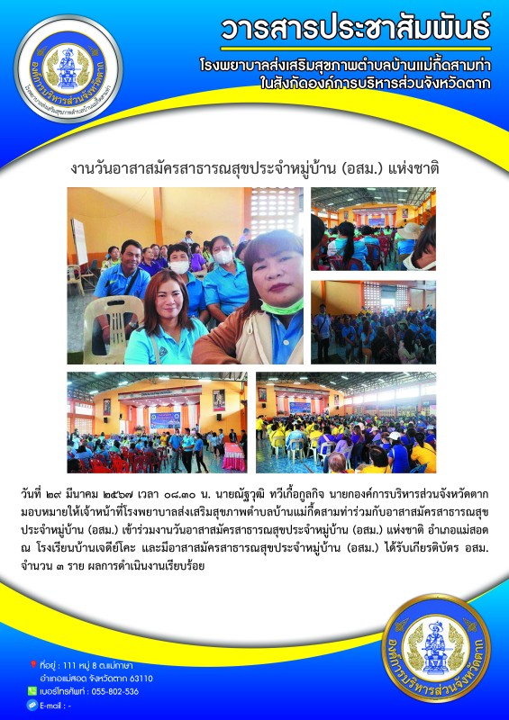 วันที่ ๑๔ พฤศจิกายน ๒๕๖๗ เวลา ๐๙.๐๐ น. นางพุดแก้ว พันธุ์สุภา รองปลัดองค์การบริหารส่วนจังหวัด รักษาราชการแทนปลัดองค์การบริหารส่วนจังหวัด ปฎิบัติหน้าที่นายกองค์การบริหารส่วนจังหวัดตาก มอบหมายให้เจ้าหน้าที่โรงพยาบาลส่งเสริมสุขภาพตำบลบ้านแม่กึ๊ดสามท่าร่วมกับเจ้าหน้าที่องค์การบริหารส่วนตำบลแม่กาษาจัดอบรมให้ความรู้ในการป้องกันตนเองจากภัยฝุ่นละออง pm 2.5 แก่ผู้นำชุมชน อาสาสมัครสาธารณสุขประจำหมู่บ้าน (อสม.) บ้านแม่กึ๊ดสามท่า หมู่ที่ ๕ และอาสาสมัครสาธารณสุขประจำหมู่บ้าน (อสม.) บ้านแม่กึ๊ดสามท่า หมู่ที่ ๘ จำนวนทั้งสิ้น ๔๐ คน ผลการดำเนินงานเป็นไปด้วยความเรียบร้อย