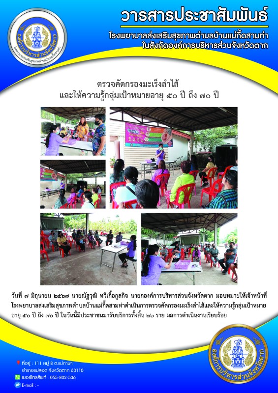 วันที่ ๗ มิถุนายน ๒๕๖๗ นายณัฐวุฒิ ทวีเกื้อกูลกิจ นายกองค์การบริหารส่วนจังหวัดตาก มอบหมายให้เจ้าหน้าที่โรงพยาบาลส่งเสริมสุขภาพตำบลบ้านแม่กึ๊ดสามท่าดำเนินการตรวจคัดกรองมะเร็งลำไส้ และให้ความรู้กลุ่มเป้าหมายอายุ ๕๐ ปี ถึง ๗๐ ปี ในวันนี้มีประชาชนมารับบริการทั้งสิ้น ๒๖ ราย ผลการดำเนินงานเรียบร้อย