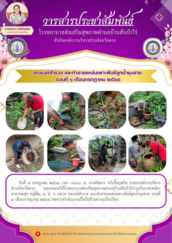 18 กรกฎาคม 2568 รพ.สต.บ้านสันป่าไร่ร่วมกับอาสาสมัครสาธารณสุขหมู่ที่2,3,5,6และ7 สำรวจและทำลายแหล่งเพาะพันธ์ลูกน้ำยุงลาย รอบที่ 2 เดือน กรกฎาคม 2568