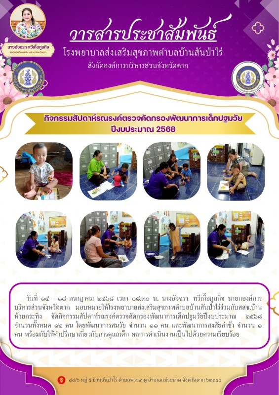 วันที่ 14-18 ก.ค. 2568 รพ.สต.บ้านสันป่าไร่และสสช.บ้านห้วยกระทิง จัดกิจกรรมสัปดาห์รณรงค์ตรวจคัดกรองพัฒนาการเด็กปฐมวัยปีงบประมาณ 2568 จำนวนทั้งหมด 12 คน โดยพัฒนาการสมวัย จำนวน 11 คน และพัฒนาการสงสัยล่าช้า จำนวน 1 คน พร้อมกับให้คำปรึกษาเกี่ยวกับการดูแลเด็ก เหตุการณ์เป็นไปด้วยความเรียบร้อย