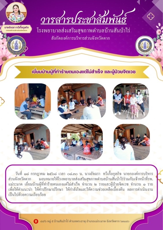 18 กรกฎาคม 2568 นางเสาร์แก้ว อ่วมพิทยา เจ้าพนักงานสาธารณสุข รพ.สต.บ้านสันป่าไร่ ร่วมกับเจ้าหน้าที่ รพ.แม่ระมาด เยี่ยมบ้านผู้ที่ทำร้ายตนเองแต่ไม่สำเร็จ จำนวน 2 รายและผู้ป่วยจิตเวช จำนวน 1 ราย เพื่อให้คำแนะนำ ปรึกษา ให้กำลังใจและให้ความช่วยเหลือเบื้องต้น
