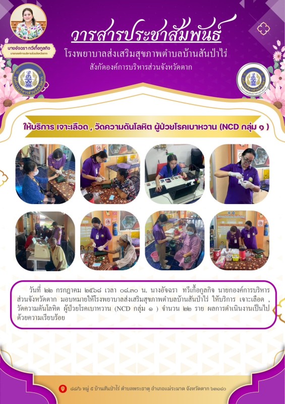 22 ก.ค.68 รพ.สต.บ้านสันป่าไร่ ให้บริการ เจาะเลือด , วัดความดันโลหิต ผู้ป่วยโรคเบาหวาน (NCD กลุ่ม 1 ) จำนวน 22 ราย