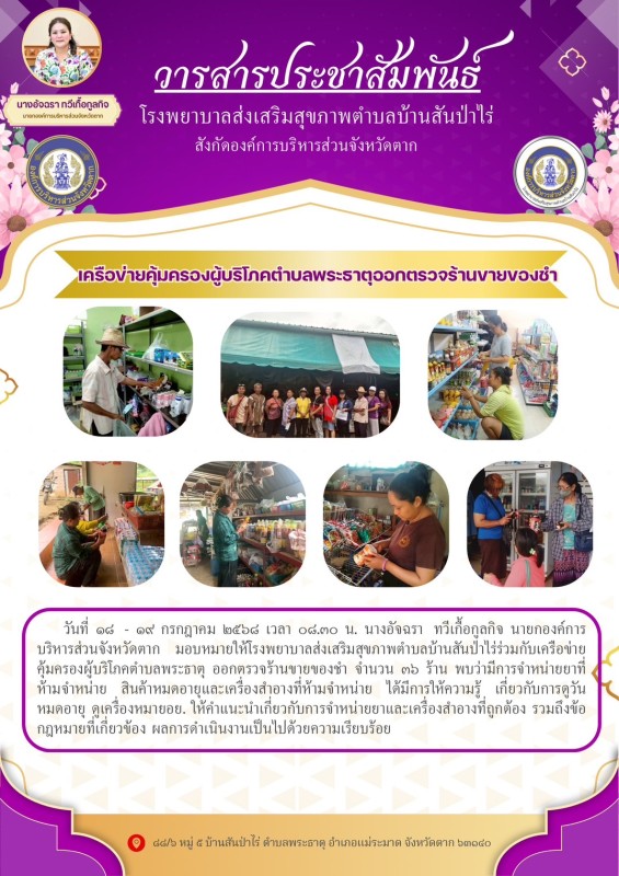 18-19 กรกฎาคม 2568 รพ.สต.บ้านสันป่าไร่ ร่วมกับเครือข่ายคุ้มครองผู้บริโภคตำบลพระธาตุ ออกตรวจร้านขายของชำ จำนวน 36 ร้าน พบว่ามีการจำหน่ายยาที่ห้ามจำหน่าย สินค้าหมดอายุและเครื่องสำอางที่ห้ามจำหน่าย ได้มีการให้ความรู้ เกี่ยวกับการดูวันหมดอายุ ดูเครื่องหมายอย.