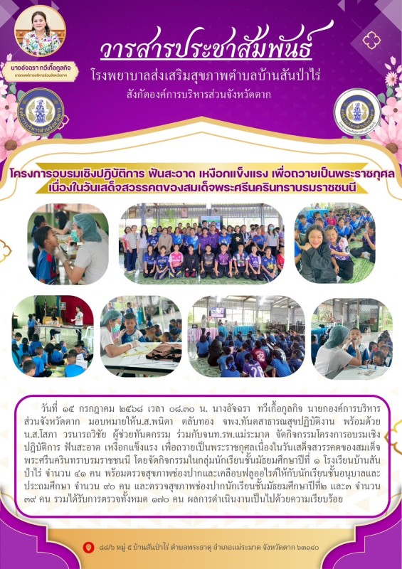 15 กรกฎาคม 2568 น.ส.พนิดา ตลับทอง จพง.ทันตสาธารณสุขปฏิบัติงาน พร้อมด้วยน.ส.โสภา วรนารถวิชัย ผู้ช่วยทันตกรรม ร่วมกับจนท.รพ.แม่ระมาด จัดกิจกรรมโครงการอบรมเชิงปฎิบัติการ ฟันสะอาด เหงือกแข็งแรง เพื่อถวายเป็นพระราชกุศลเนื่องในวันเสด็จสวรรคตของสมเด็จพระศรีนครินทราบรมราชชนนี โดยจัดกิจกรรมในกลุ่มนักเรียนชั้นมัธยมศึกษาปีที่ 1 โรงเรียนบ้านสันป่าไร่ จำนวน 41 คน พร้อมตรวจสุขภาพช่องปากและเคลือบฟลูออไรด์ให้กับนักเรียนชั้นอนุบาลและประถมศึกษา จำนวน 90 คน และตรวจสุขภาพช่องปากนักเรียนชั้นมัธยมศึกษาปีที่2และ3 จำนวน 39 คน รวมได้รับการตรวจทั้งหมด 170 คน