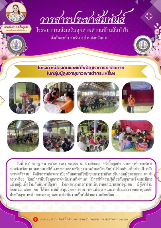 24 กรกฎาคม 2568 จนท.รพ.สต.บ้านสันป่าไร่ร่วมกับเครือข่ายเฝ้าระวังการฆ่าตัวตาย จัดกิจกรรมโครงการป้องกันและแก้ไขปัญหาการฆ่าตัวตายในกลุ่มผู้สูงอายุชาวเขาเผ่ากระเหรี่ยง โดยมีการคืนข้อมูลการดำเนินงานที่ผ่านมา มีการให้ความรู้เกี่ยวกับสุขภาพจิตและมีการแบ่งกลุ่มเพื่อร่วมกันค้นหาปัญหา ร่วมหาแนวทางการดำเนินงานและมาตรการชุมชน มีผู้เข้าร่วมกิจกรรม 120 คน ได้รับการสนับสนุนวิทยากรจาก รพ.แม่ระมาดและงบประมาณจากกองทุนหลักประกันสุขภาพตำบลพระธาตุ