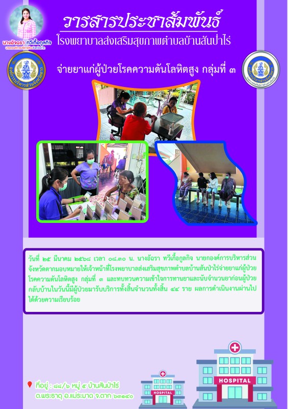 25 มี.ค.68 รพ.สต.บ้านสันป่าไร่ จ่ายยาแก่ผู้ป่วยโรคความดันโลหิตสูง กลุ่มที่ 3 จำนวน 44 ราย และทบทวนความเข้าใจการทานยาและนับจำนวนยาก่อนผู้ป่วยกลับบ้าน