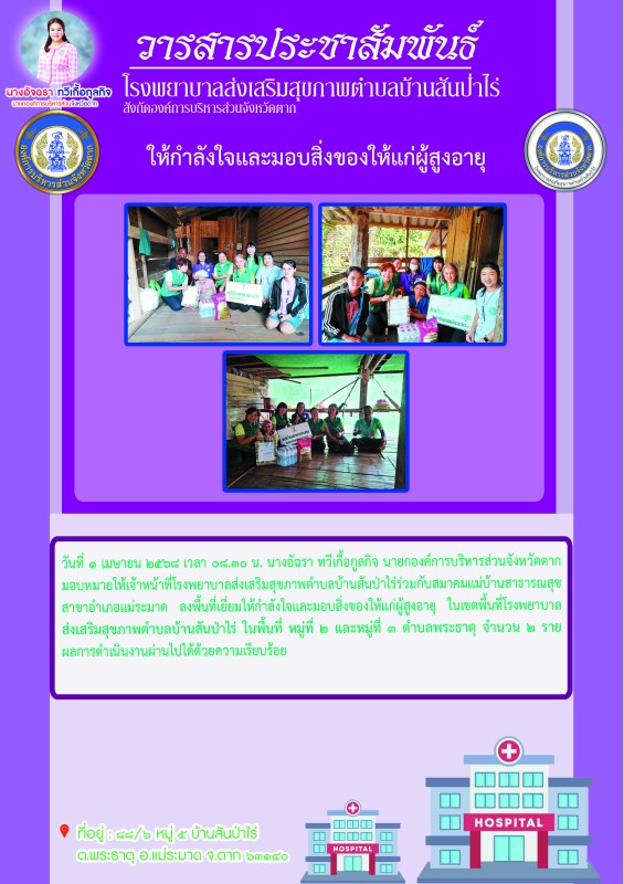 1/4/68 สมาคมแม่บ้านสาธารณสุข สาขาอำเภอแม่ระมาด ร่วมกับ รพ.สต.บ้านสันป่าไร่ ลงพื้นที่เยี่ยมให้กำลังใจและมอบสิ่งของให้แก่ผู้สูงอายุ เขต รพ.สต.บ้านสันป่าไร่ จำนวน 3 คน