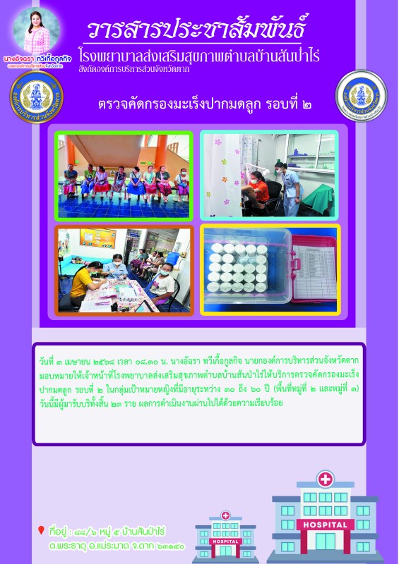 3 เม.ย.68 รพ.สต.บ้านสันป่าไร่ ตรวจคัดกรองมะเร็งปากมดลูก รอบสอง ในสตรีกลุ่มเป้าหมาย อายุ 30-60 ปี(หมู่ 2 และ 3) มีผู้มารับบริการทั้งหมด 23 ราย