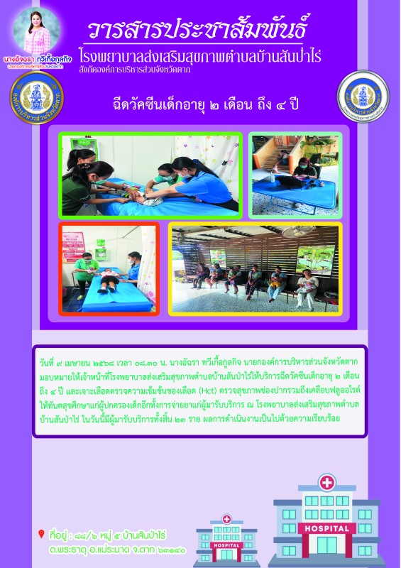 9 เม.ย.68 รพ.สต.บ้านสันป่าไร่ ให้บริการฉีดวัคซีนเด็กอายุ 2 เดือน ถึง 4 ปี จำนวน 23 ราย และตรวจสุขภาพช่องปาก,เคลือบฟลูออไรด์,ให้ทันตสุขศึกษาแก่ผู้ปกครองเด็ก,เจาะเลือดตรวจความเข้มข้นของเลือด(Hct),จ่ายยา para syr และ ferrous syr