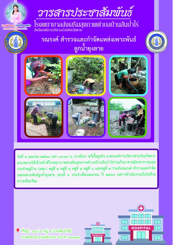 18 เมษายน 2568 รพ.สต.บ้านสันป่าไร่ร่วมกับอาสาสมัครสาธารณสุข หมู่ที่2,3,5,6และ7 รณรงค์สำรวจและทำลายแหล่งเพาะพันธ์ลูกน้ำยุงลาย รอบที่ 2 เดือน เมษายน 2568