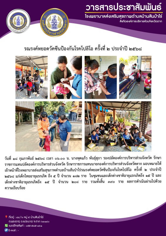 18 ก.พ.68 รพ.สต.บ้านสันป่าไร่ รณรงค์หยอดวัคซีนป้องกันโรคโปลิโอ รอบสอง ในพื้นที่รับผิดชอบ จำนวน 5 หมู่บ้าน ผู้รับบริการ เด็กไทย 182 คน + เด็กต่างชาติ จำนวน 208 คน รวม 390 คน