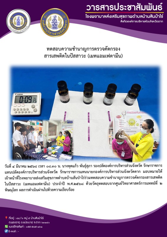 4 มี.ค.68 รพ.สต.บ้านสันป่าไร่ ทดสอบความชำนาญ การตรวจคัดกรองสารเสพติดในปัสสาวะ(เมทแอมเฟตามีน) ประจำปี พ.ศ.2568 ด้วยวัตถุทดสอบจากศูนย์วิทยาศาสตร์การแพทย์ที่ 2 พิษณุโลก