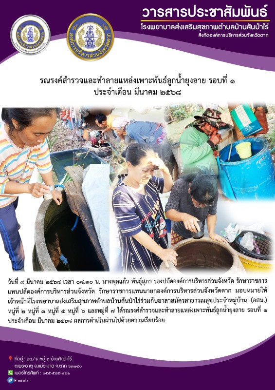 9 มีนาคม 2568 รพ.สต.บ้านสันป่าไร่ร่วมกับอาสาสมัครสาธารณสุข หมู่ที่2,3,5,6และ7 รณรงค์สำรวจและทำลายแหล่งเพาะพันธ์ลูกน้ำยุงลาย รอบที่ 1 ประจำเดือน มีนาคม 2568