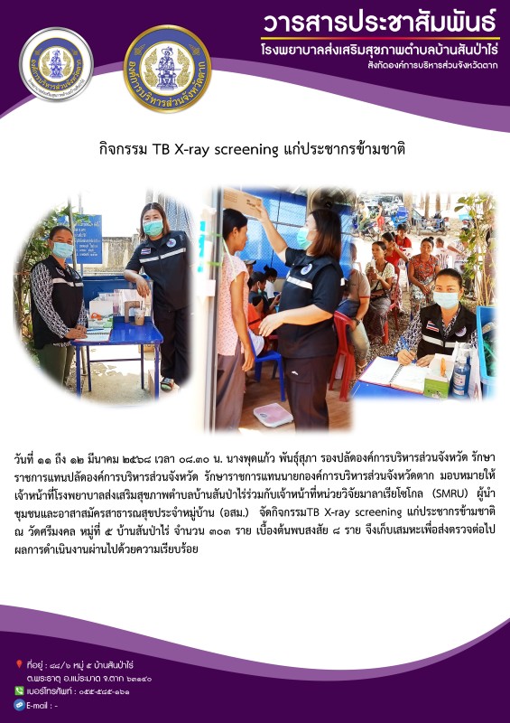 11-12 มีนาคม 2568 รพ.สต.บ้านสันป่าไร่ร่วมกับหน่วยวิจัยมาลาเรียโซโกล(SMRU) ,ผู้นำชุมชนและอาสาสมัครสาธารณสุข หมู่ที่ 5 บ้านสันป่าไร่ จัดกิจกรรมTB X-ray screening แก่ประชากรข้ามชาติ หมู่ที่ 5 บ้านสันป่าไร่ ณ วัดศรีมงคล จำนวน 303 คน พบสงสัย 8 คนและเก็บเสมหะส