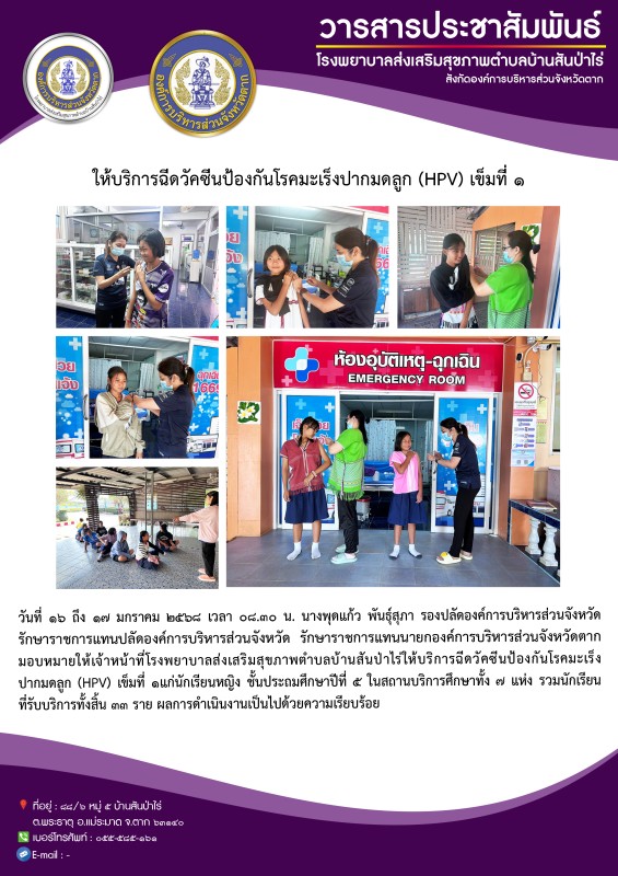 16-17 ม.ค.68 รพ.สต.บ้านสันป่าไร่ ให้บริการฉีดวัคซีนป้องกันโรคมะเร็งปากมดลูก(HPV) เข็มที่ 1 แก่นักเรียนหญิง ชั้น ป.5 จำนวน 7 โรงเรียน รวมทั้งหมด 33 ราย