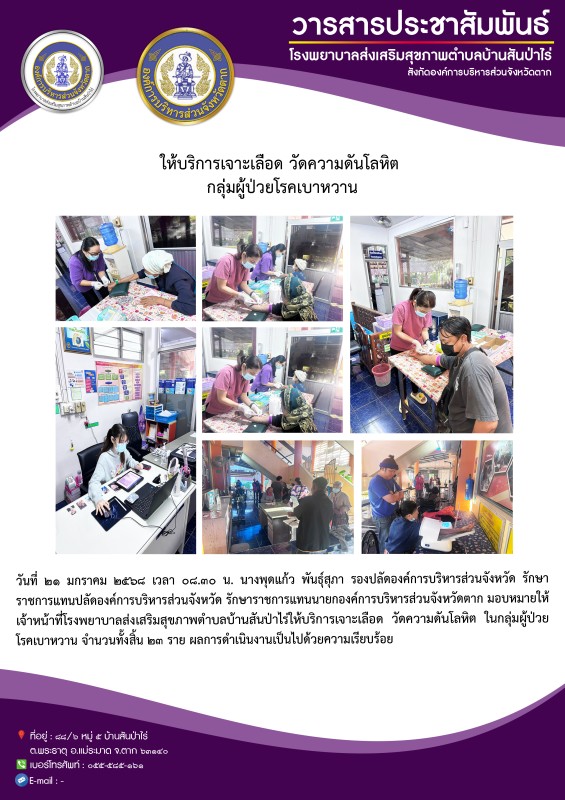 21 ม.ค.68 รพ.สต.บ้านสันป่าไร่ ให้บริการเจาะเลือด,วัดความดันโลหิต ผู้ป่วยเบาหวาน จำนวน 23 ราย