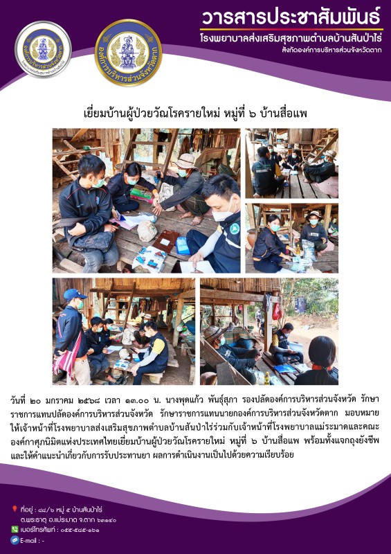 20/1/68 จนท.รพ.สต.บ้านสันป่าไร่ร่วมกับจนท.รพ.แม่ระมาดและคณะองค์กาศุภนิมิตแห่งประเทศไทย เยี่ยมบ้านผู้ป่วยวัณโรครายใหม่ที่หมู่6 บ้านสื่อแพ พร้อมทั้งแจกถึงยังชีพและให้คำแนะนำเกี่ยวกับการรับประทานยา