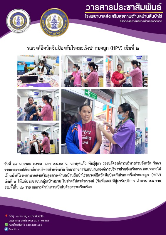 21 ม.ค.68 รพ.สต.บ้านสันป่าไร่ รณรงค์ฉีดวัคซีนป้องกันโรคมะเร็งปากมดลูก(HPV) เข็มที่ 2 ให้แก่ประชาชนกลุ่มเป้าหมาย ในช่วงสัปดาห์รณรงค์ เป็นวันที่สอง วันนี้มีผู้มารับบริการ จำนวน 53 คน รวมทั้งหมด 99 คน