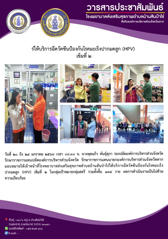 20-24 ม.ค.68 รพ.สต.บ้านสันป่าไร่ ให้บริการฉีดวัคซีนป้องกันโรคมะเร็งปากมดลูก(HPV) เข็มที่ 2 ให้แก่สตรีกลุ่มเป้าหมาย