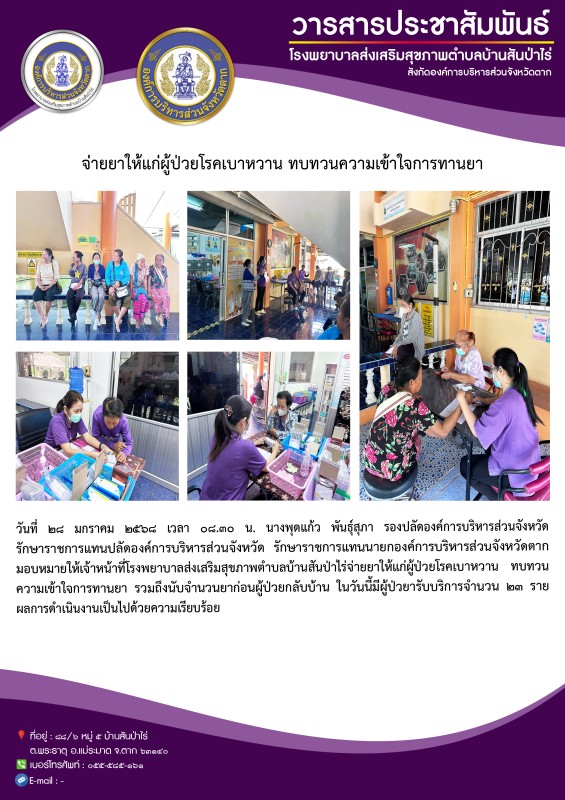 28 ม.ค.68 รพ.สต.บ้านสันป่าไร่ จ่ายยาให้แก่ผู้ป่วยโรคเบาหวาน จำนวน 23 ราย มีกิจกรรมแลกเปลี่ยนเรียนรู้ , ทบทวนความเข้าใจการทานยา และ นับจำนวนยาก่อนผู้ป่วยกลับบ้าน