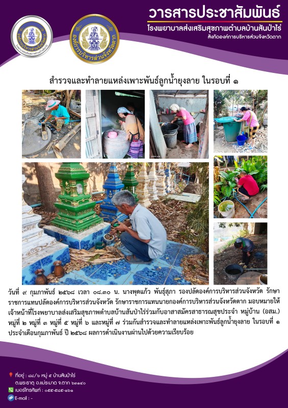 9 ก.พ. 68 เจ้าหน้าที่ รพ.สต.บ้านสันป่าไร่ร่วมกับอาสาสมัครสาธารณสุข ม.2,3,5,6และ7 สำรวจและทำลายแหล่งเพาะพันธ์ลูกน้ำยุงลาย รอบที่ 1 เดือน ก.พ. 68
