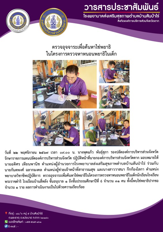 22 พ.ย. 67 นายอดิศร เทียนพานิช ผอ.รพ.สต.บ้านสันป่าไร่ ร่วมกับนายกันตพงศ์ ฉลากมงคล ผู้ช่วยเจ้าหน้าที่สาธารณสุขและน.ส.วาสนา กึกก้องโลกา พยาบาลวิชาชีพปฎิบัติการ ตรวจอุจจาระเพื่อค้นหาไข่พยาธิในโครงการตรวจหาหนอนพยาธิในเด็กนักเรียนโรงเรียนพระราชดำริโรงเรียนบ้านสี่หลัง ชั้นอนุบาล 1 - ป.6 จำนวน 31 คน พบไข่พยาธิปากขอ จำนวน 1 คน