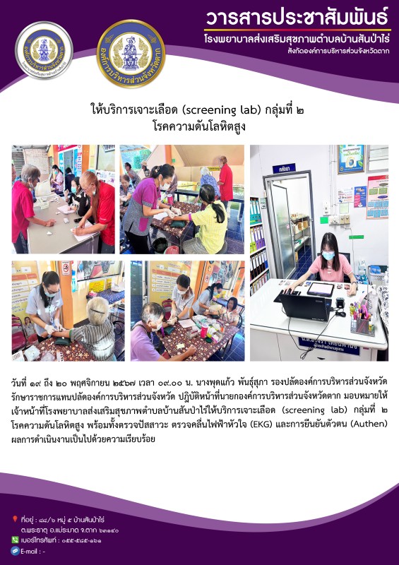 19-20 พ.ย.67 รพ.สต.บ้านสันป่าไร่ เจาะเลือด(screening lab)ผู้ป่วย NCD กลุ่ม 2 โรคความดันโลหิตสูง จำนวน 51 ราย พร้อมทั้งตรวจปัสสาวะ , ตรวจคลื่นไฟฟ้าหัวใจ(EKG) , วัดรอบเอว , ยืนยันตัวตน(Authen)