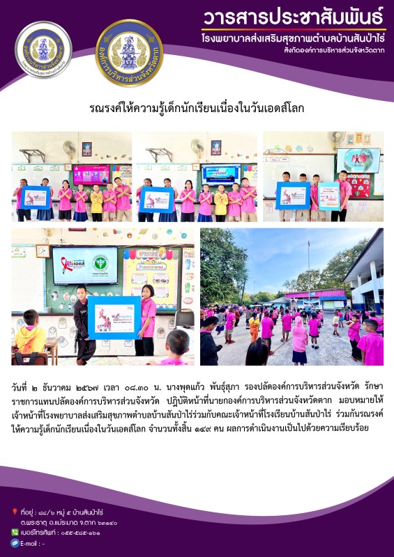 2/12/67 รพ.สต.บ้านสันป่าไร่ร่วมกับโรงเรียนบ้านป่าไร่เหนือ ให้ความรู้แก่เด็กนักเรียน จำนวน 149 คน เนื่องในวันเอดส์โลก