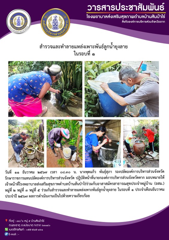 11/12/67 รพ.สต.บ้านสันป่าไร่ร่วมกับอาสาสมัครหมู่ที่2,3และ5 สำรวจและทำลายแหล่งเพาะพันธ์ลูกน้ำยุงลาย รอบที่ 1 เดือนธันวาคม 67