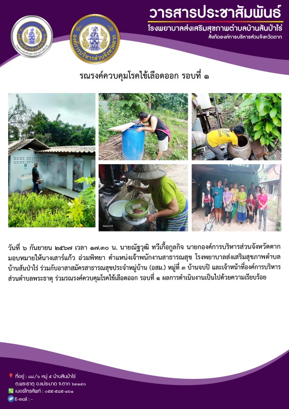 28 ส.ค. 67 เวลา 14.00 น. นายอดิศร เทียนพานิช ผอ.รพ.สต.บ้านสันป่าไร่ และนางเสาร์แก้ว อ่วมพิทยา เจ้าพนักงานสาธารณสุข รพ.สต.บ้านสันป่าไร่ ร่วมกับอาสาสมัครสาธารณสุข ม.5 บ้านสันป่าไร่และอบต.พระธาตุ ควบคุมโรคไข้เลือดออก รอบแรก 100 เมตร รอบบ้านผู้ป่วยเคสนางคำนวน