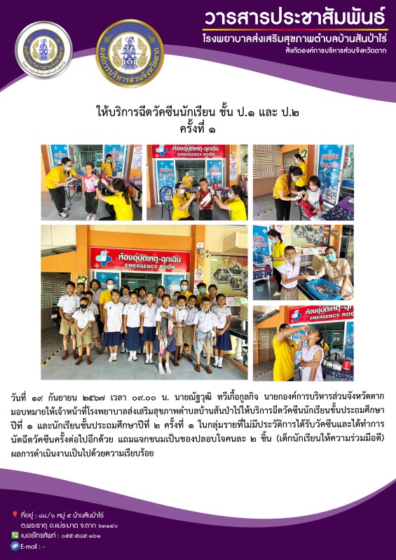 19 ก.ย.67 รพ.สต.บ้านสันป่าไร่ ฉีดวัคซีนนักเรียน ครั้งที่ 1 ให้แก่นักเรียนชั้น ป.1 และ ป.2 ที่ไม่มีประวัติการได้รับวัคซีน จำนวน 39 ราย และนัดฉีดครั้งต่อไป อีก 3 ครั้ง เด็ก ๆ เก่งมาก ๆ น่ารักทุกคนเลย (หมอแจกขนมปลอบใจให้คนละ 2 ชิ้น สำหรับ 2 เข็มนี้)