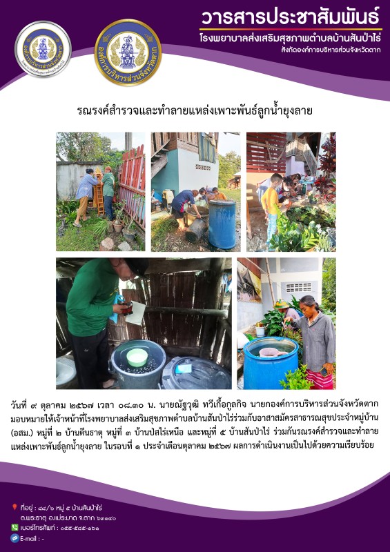 9 ต.ค.67 อาสาสมัครสาธารณสุข หมู่ที่ 2 บ้านตีนธาตุ หมู่ที่ 3 บ้านป่าไร่เหนือและหมู่ที่ 5 บ้านสันป่าไร่ รณรงค์สำรวจและทำลายแหล่งเพาะพันธ์ลูกน้ำยุงลาย รอบแรกเดือนตุลาคม 67