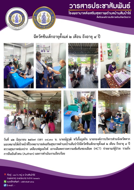 10 ก.ค.67 รพ.สต.บ้านสันป่าไร่ ให้บริการฉีดวัคซีนเด็กอายุ 2 เดือน ถึง 4 ปี , ตรวจสุขภาพช่องปาก , เคลือบฟลูออไรด์ , ให้ทันตสุขศึกษา , เจาะเลือดตรวจความเข้มข้นของเลือด(hct), จ่ายยา para syr + ferrous syr , ยืนยันตัวตน(Authen) จำนวน 25 ราย