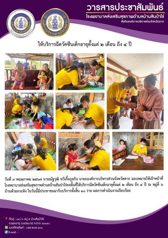 9 พ.ค.67 รพ.สต.บ้านสันป่าไร่ ออกหน่วยฉีดวัคซีนเด็กอายุ 2 เดือน ถึง 4 ปี ที่บ้านห้วยกระทิง หมู่ 6 ต.พระธาตุ จำนวน 10 ราย